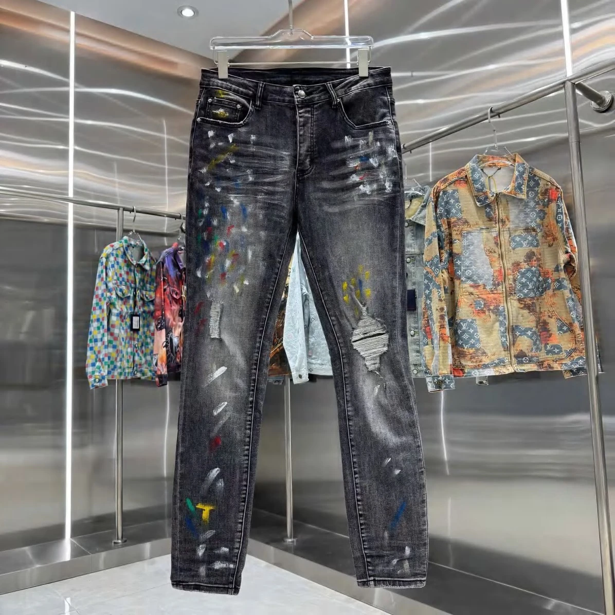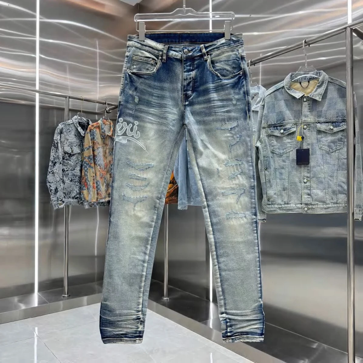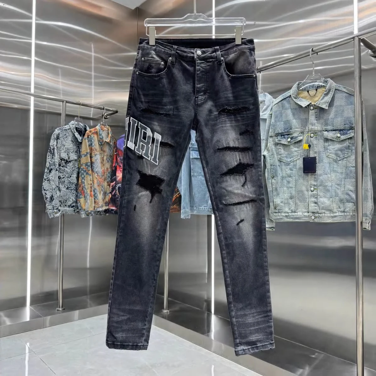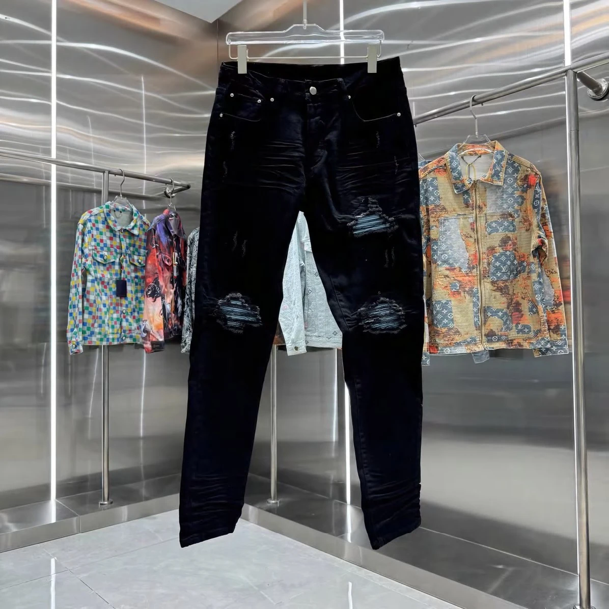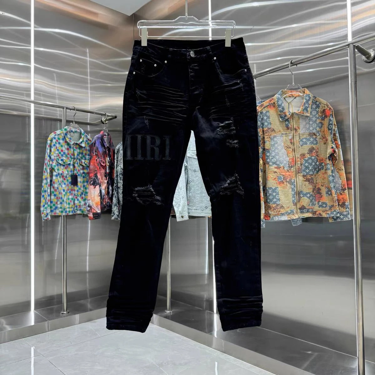 Experience the perfect fusion of luxury and urban cool. Amiri's signature attention to detail is evident in every stitch and tear, creating a high-quality garment that stands the test of time. These jeans are more than just an article of clothing; they're a statement piece that embodies effortless confidence. Dress them up with a crisp shirt and boots for a night out, or pair them with a graphic tee and sneakers for a relaxed weekend vibe. The versatility of these distressed black denim jeans makes them an indispensable addition to any discerning wardrobe.