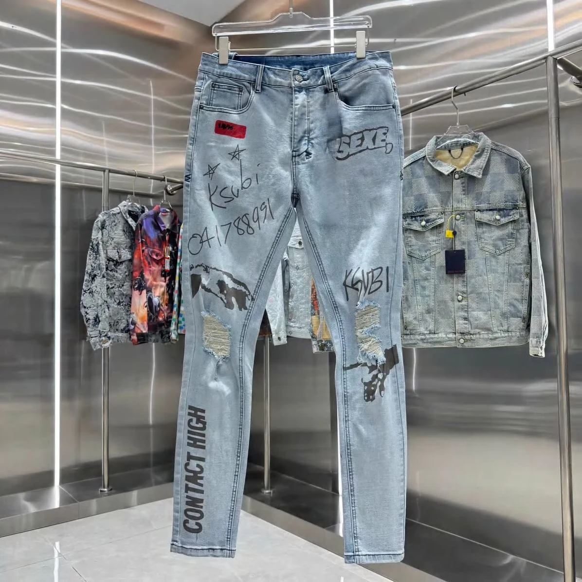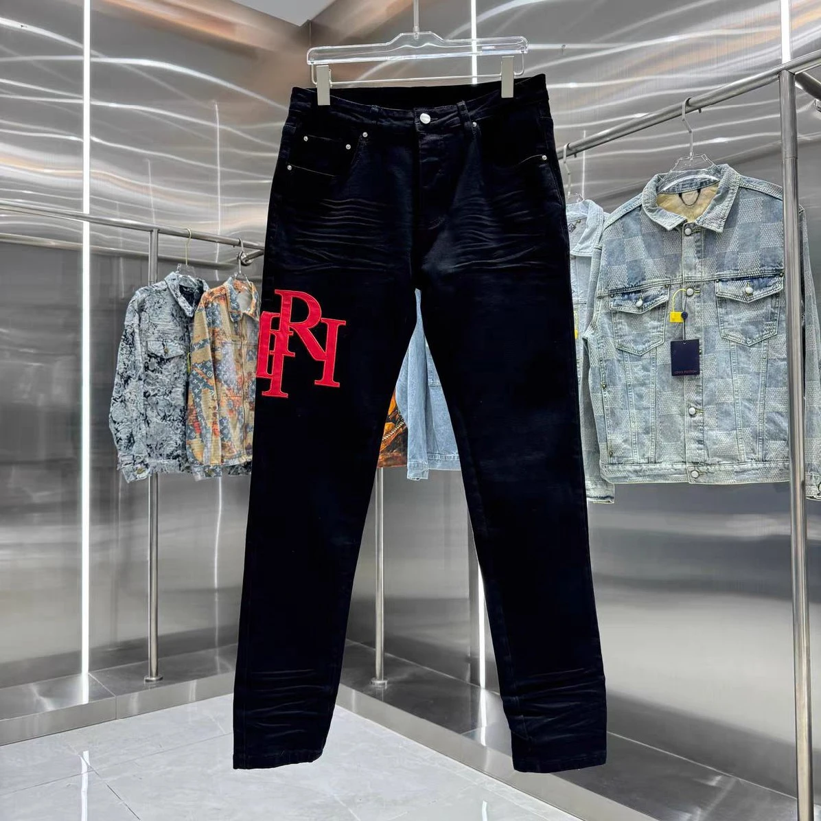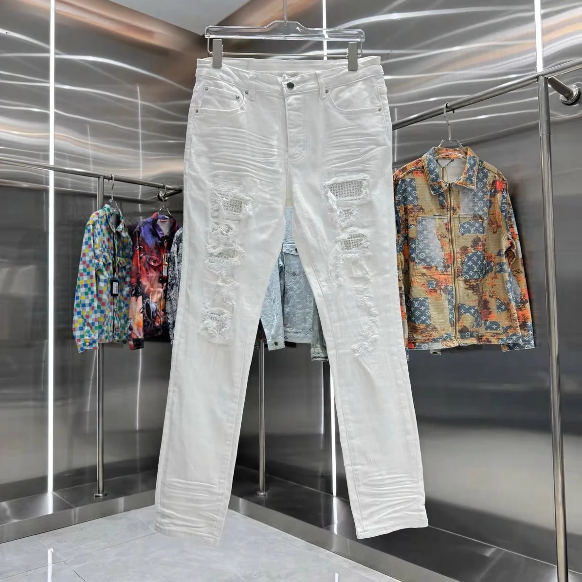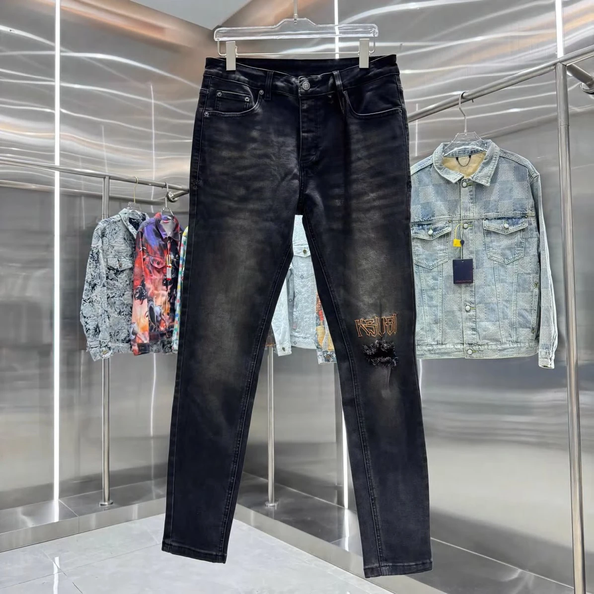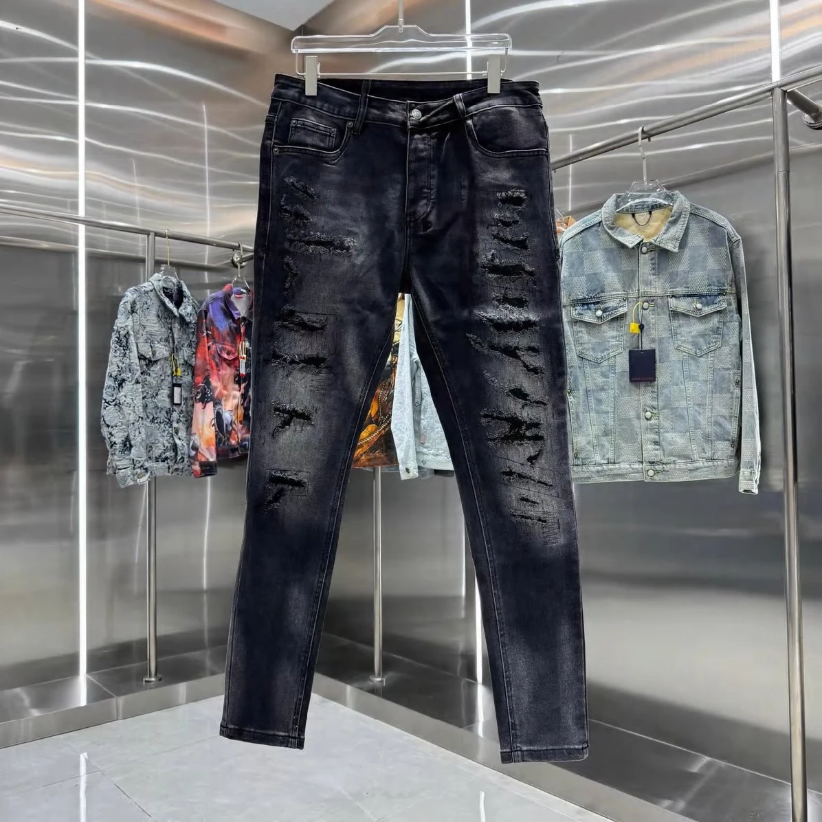 Experience the perfect fusion of luxury and urban cool. Amiri's signature attention to detail is evident in every stitch and tear, creating a high-quality garment that stands the test of time. These jeans are more than just an article of clothing; they're a statement piece that embodies effortless confidence. Dress them up with a crisp shirt and boots for a night out, or pair them with a graphic tee and sneakers for a relaxed weekend vibe. The versatility of these distressed black denim jeans makes them an indispensable addition to any discerning wardrobe.